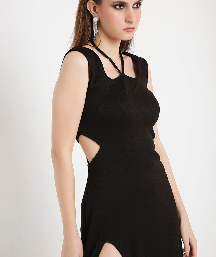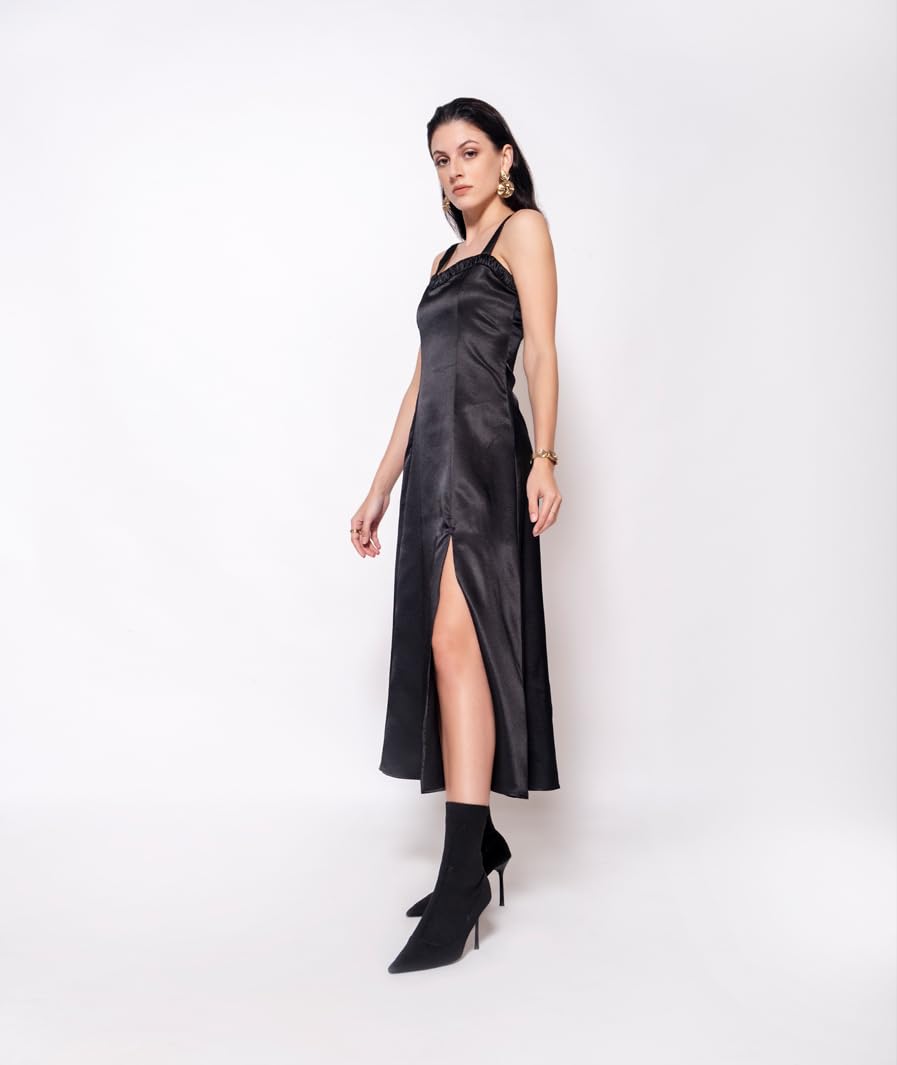 MARCEL & MAE Women's Black Satin Midi Dress – Sleeveless Elegant Dress with Side Slit, Perfect for Evening & Party Outfits (US, Alpha, X-Small, Regular, Regular, Black)
