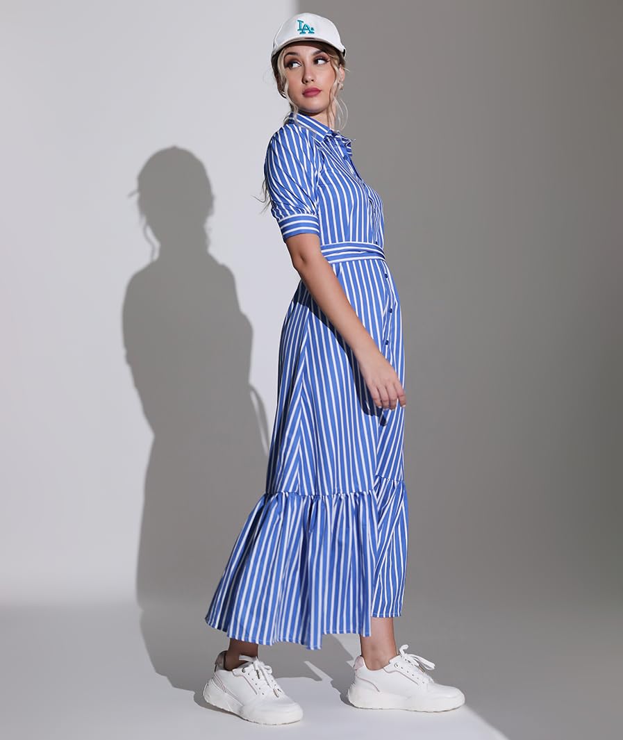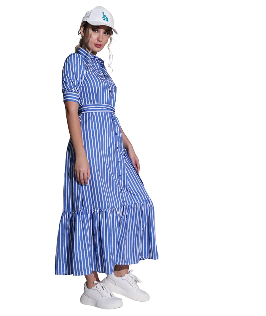 MARCEL & MAE Women's Striped Shirt Dress with Belt | Elegant Midi-Length A-Line Dress | Slim Fit Design (US, Alpha, Medium, Regular, Regular, Blue)