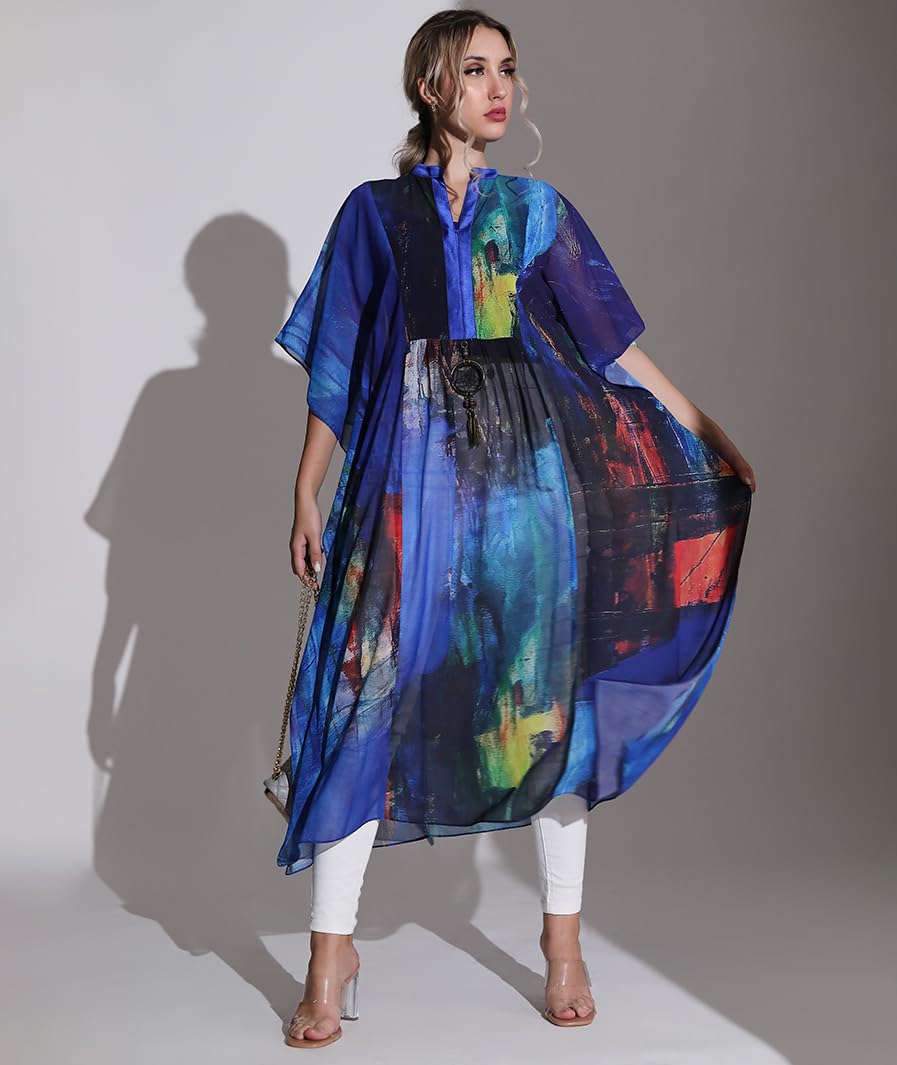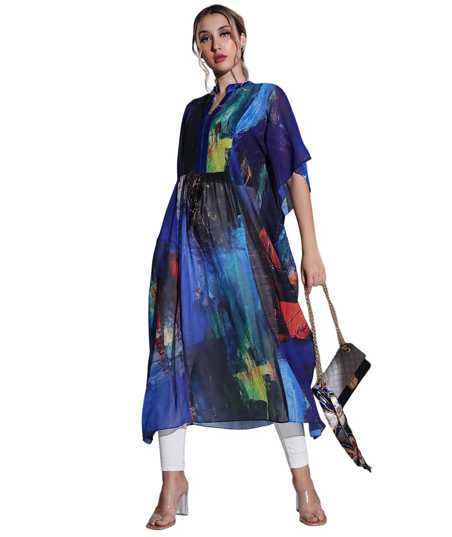 MARCEL & MAE Blue Canvas Kaftan with Embellishments - Elegant Women's Maxi Dress, Abstract Print, Comfortable & Stylish (size- small/medium)
