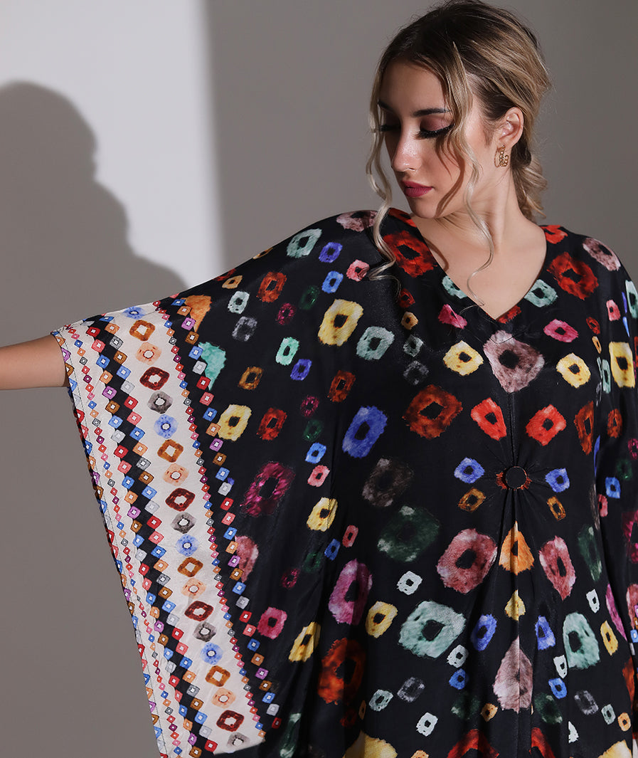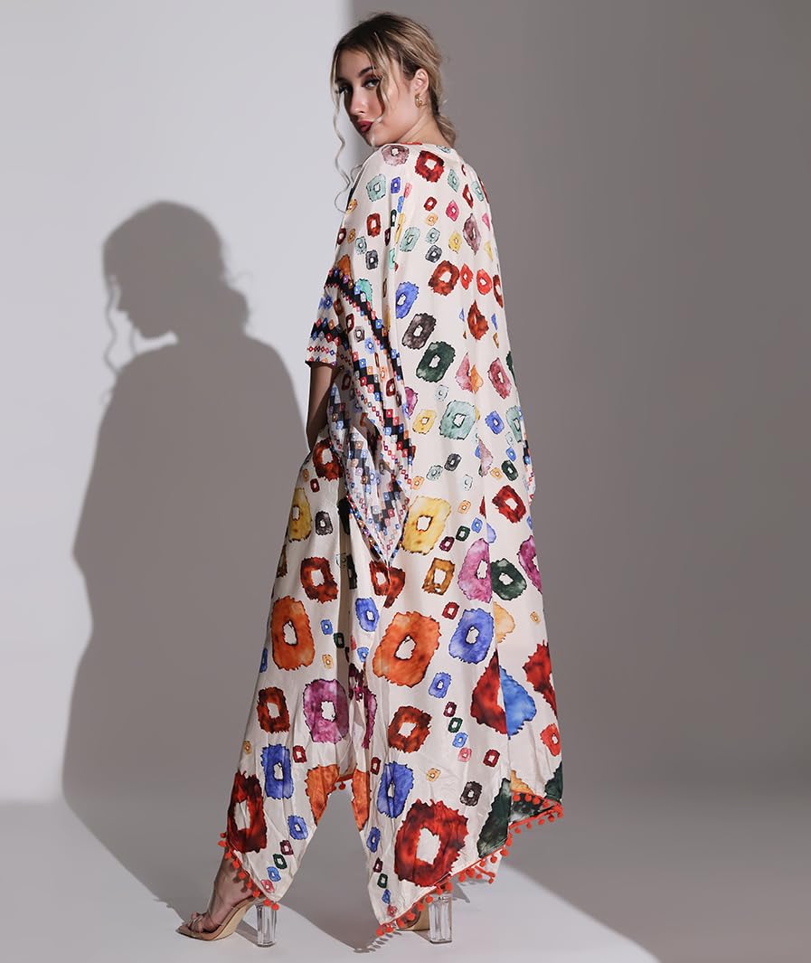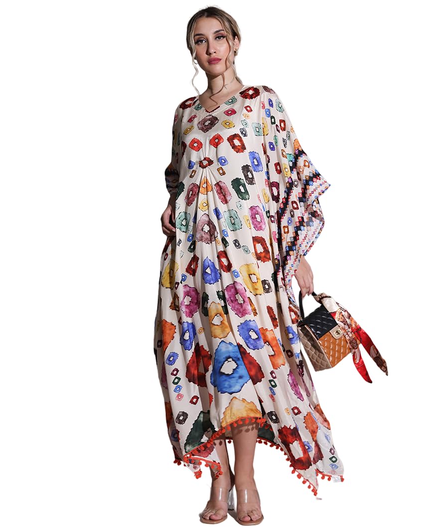MARCEL & MAE Bohemian Multi-Color Printed Kaftan Dress with Inner | Ethnic V-Neck Maxi with Tassel Hem for Women