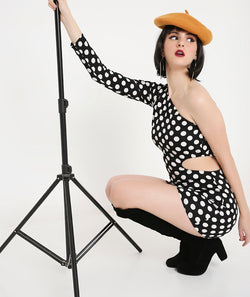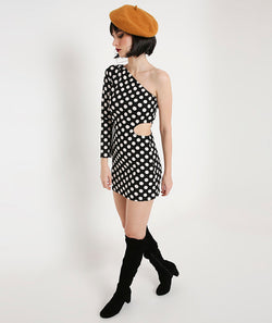 Polka Dots Off Shoulder Puff Sleeve Dress with Centre detail